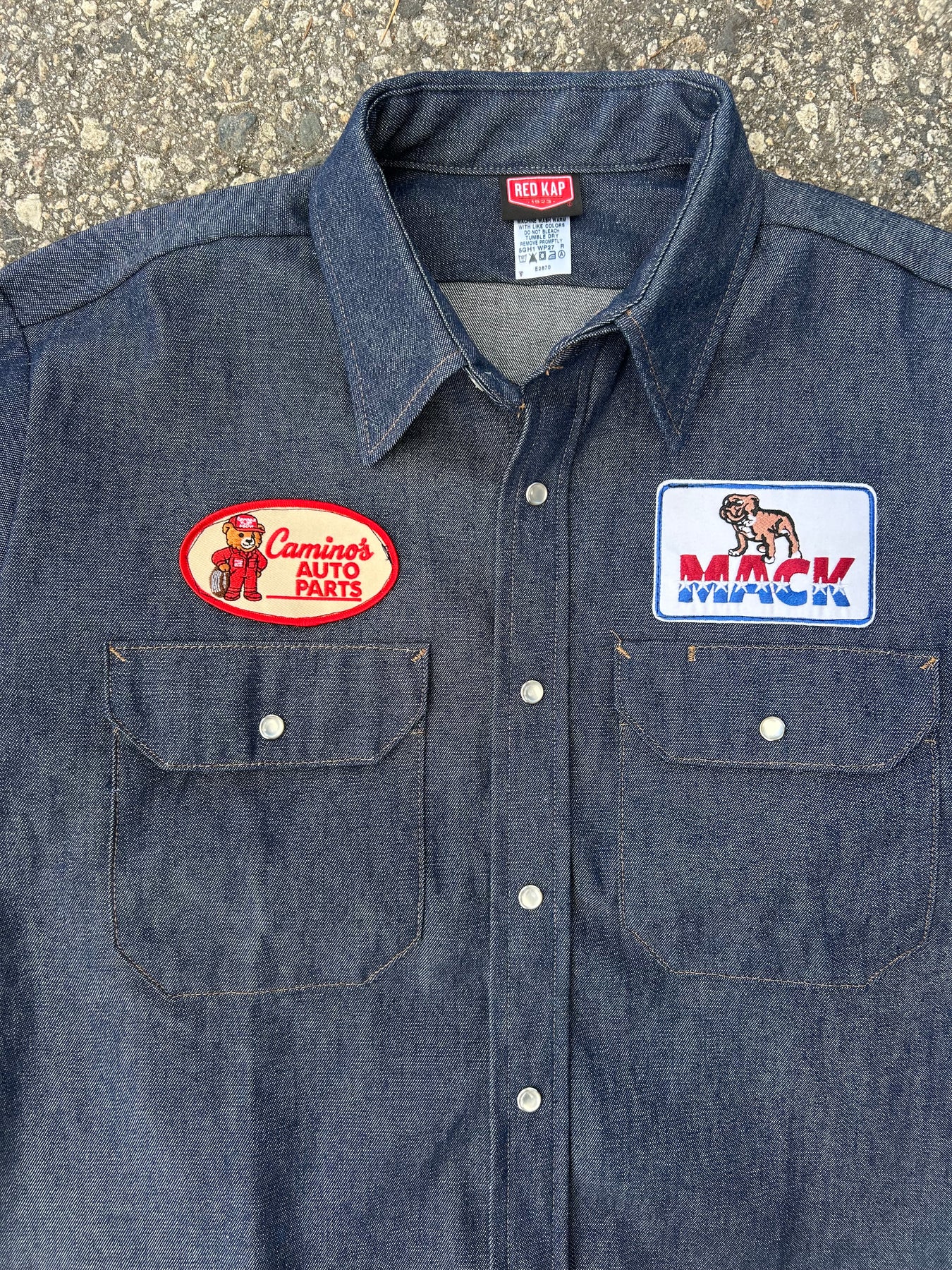 • Vintage-inspired denim work shirt featuring Camino’s Auto Parts + Mack Trucks patches.
